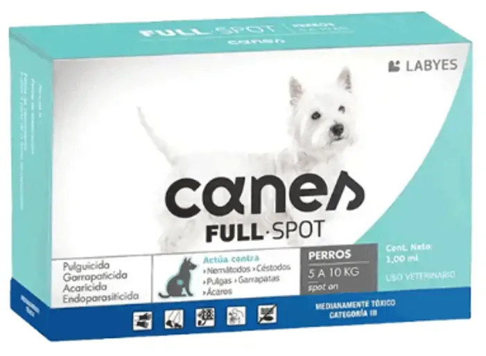 Canes Fullspot, endectocida de aplicación spot-on. Su efectiva formulación elimina los parásitos internos y externos que frecuentemente afectan a los perros.